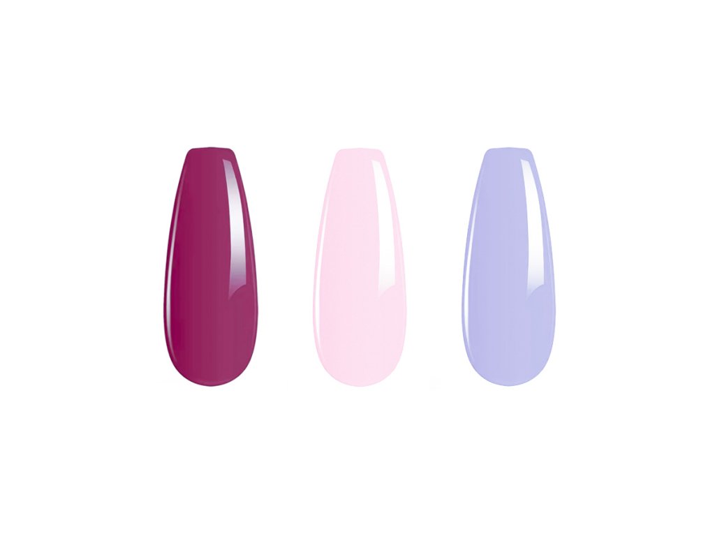 Roztomilá sada UV gelů v květinových odstínech magenta, světlá růžová, levandulová pro jemný vzhled nehtů.