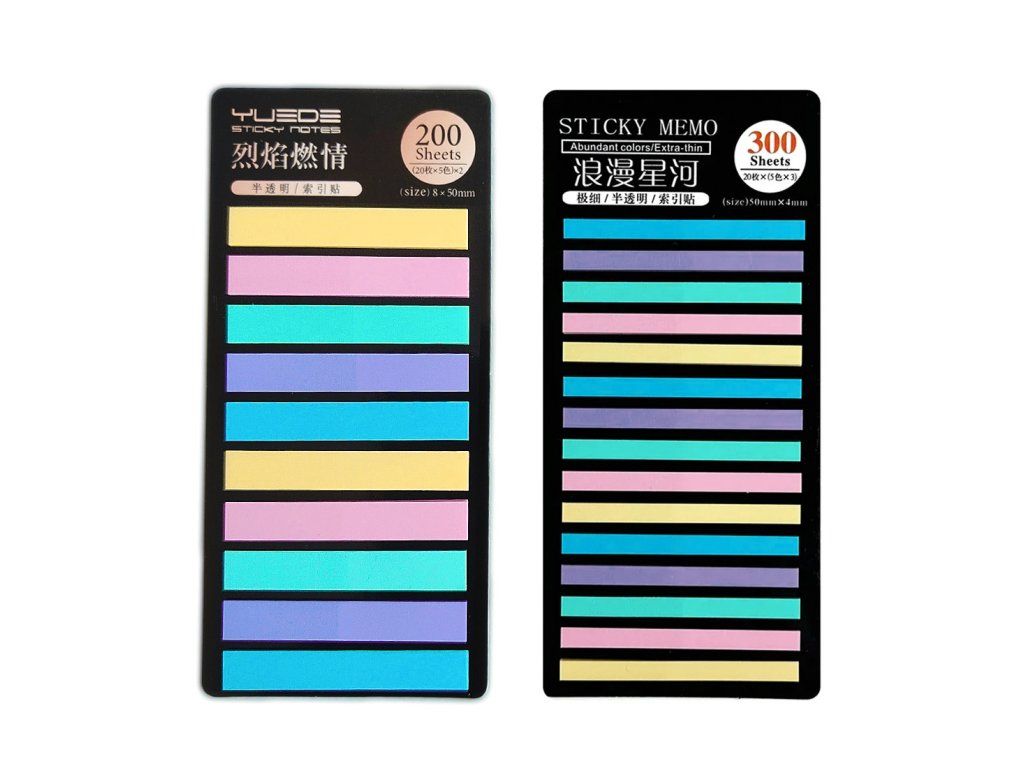 - Druh: transparentní poznámkové štítky, samolepicí záložky, zvýrazňování textu